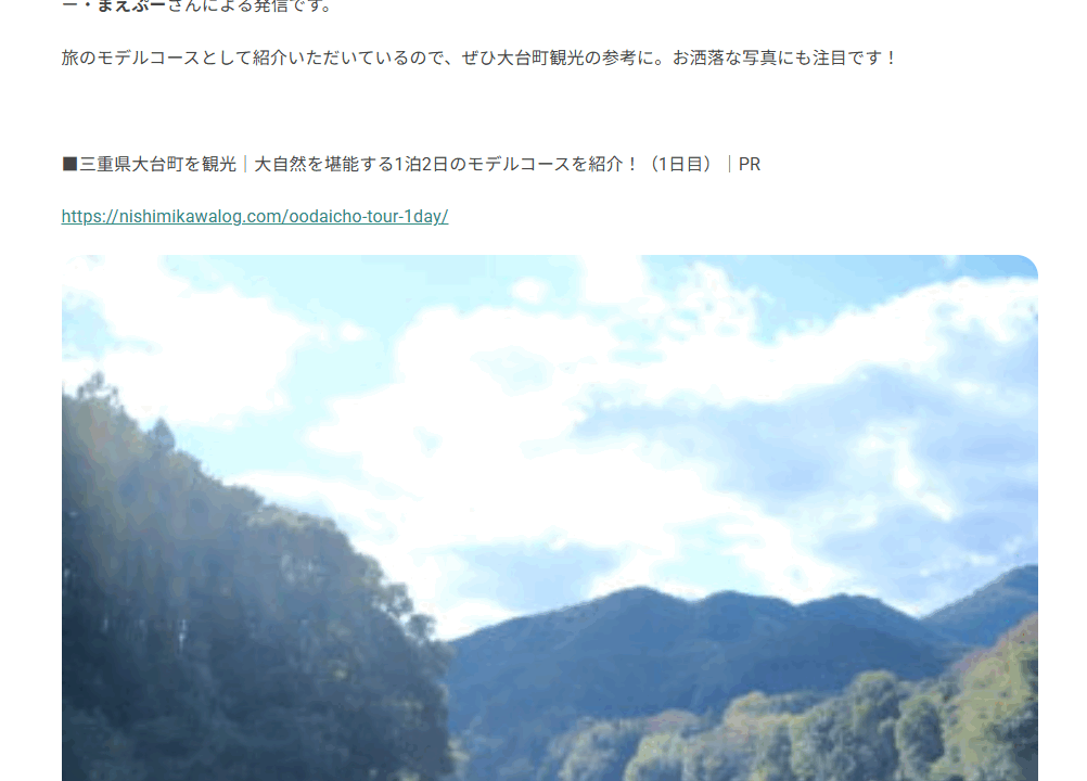 サイトを閉じてしまったので記事本文までは確認することが難しいのですが、三重県大台町の魅力発信ツアーに参加した際、ライティングの記事を作成いたしました。