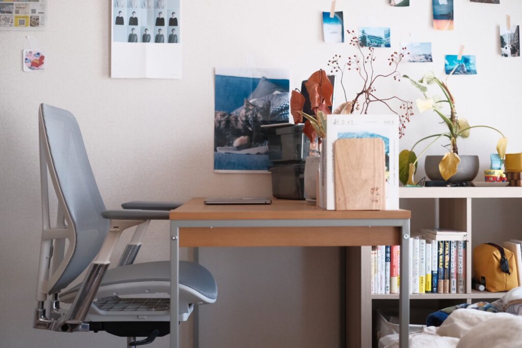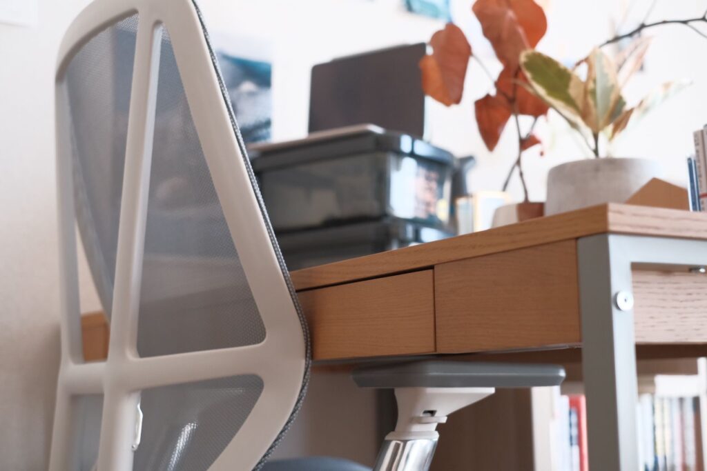 ゴリゴリとしたワークチェアなら身を預けて、身体(特に切れ痔を患っているおしり!)への負担を軽減することができるので魅力的だったのですが、作業スペースが限られていること、デザインが好みではないことを踏まえてこちらに。